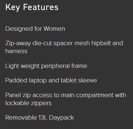 I have the Osprey Fairview 55. It’s a big 42 litre rucksack with an additional detachable 13L daypack. This is a women’s fit rucksack. The men’s version is the Farpoint 55.