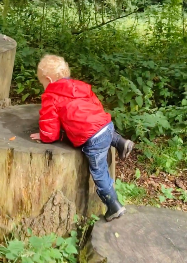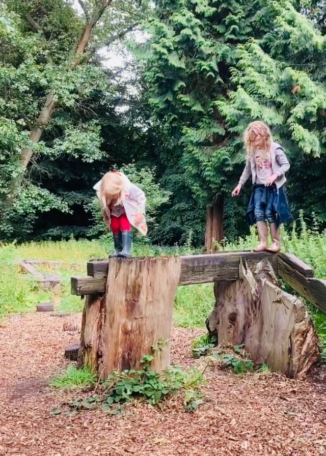 We retraced our steps to the cafe to get the kids an ice cream and then we headed into the woods on the South side of the railway. There was a big fallen tree to climb immediately on the left, and then the woods just went on an on!